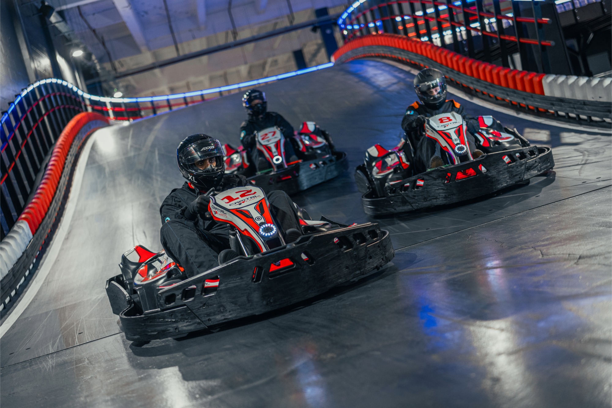 The track stretches over 600 metres across multiple levels, featuring 12 fast flowing corners and long straights where drivers can reach speeds of up to 45mph. The fully electric BIZ Eco Volt GT karts deliver instant torque, sharp handling and consistent power lap after lap, with no fumes and no engine lag. Whether you are a complete beginner or an experienced racer, the track is designed to challenge and excite.